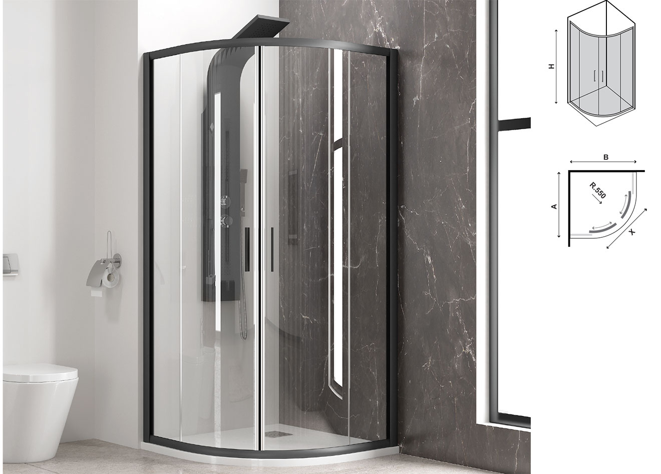 BIANCO / NERO:Ημικυκλική 90x90x190h Βαρέως Τύπου με Κρύσταλλο Ασφαλείας Διαφανές 6mm